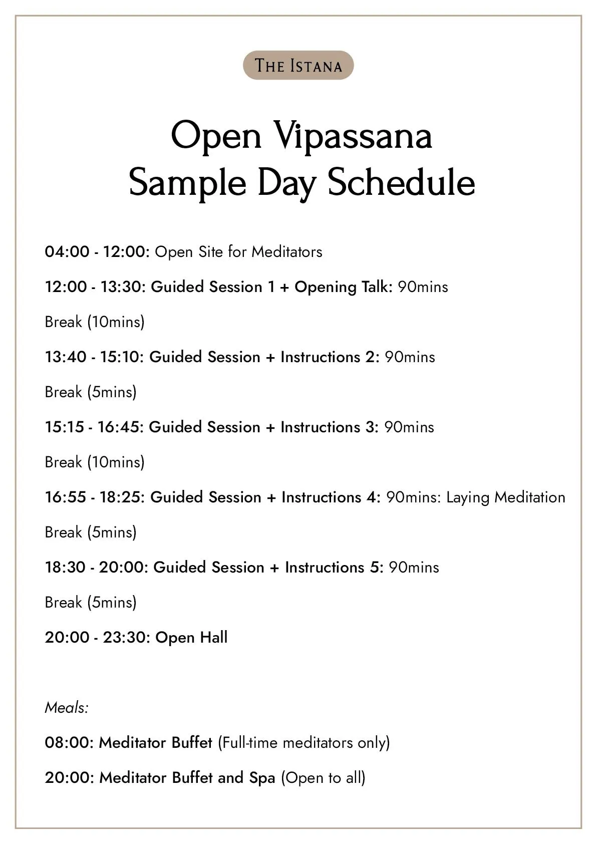 We have a few different schedules for you to choose from, but our most intense and classic schedule is at least 12hrs 30mins of practice a day in full silence. It’s a good time.